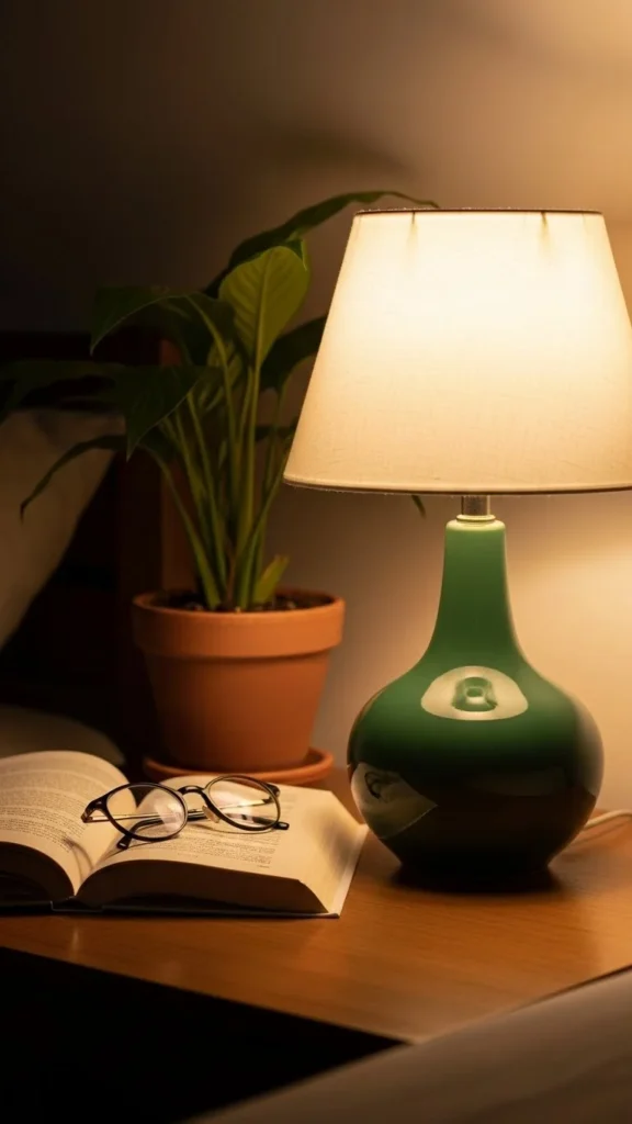 Add one green element on bedside tables. Keep surfaces uncluttered.
