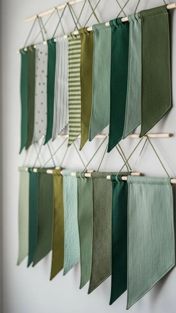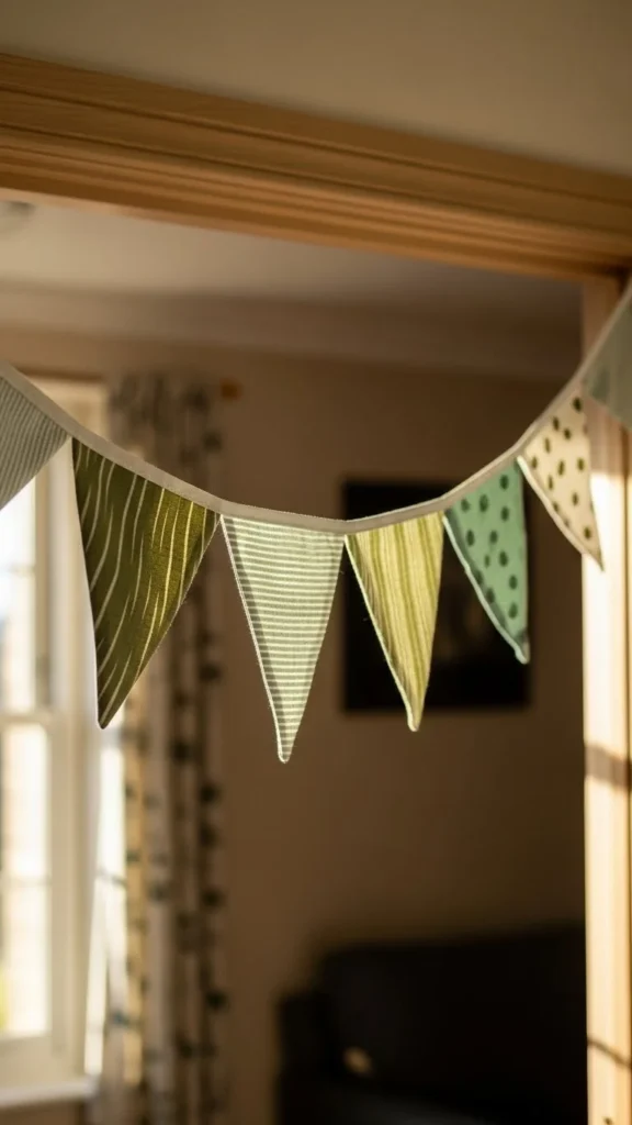 Fabric pennants feel softer than paper. Keep shapes simple.