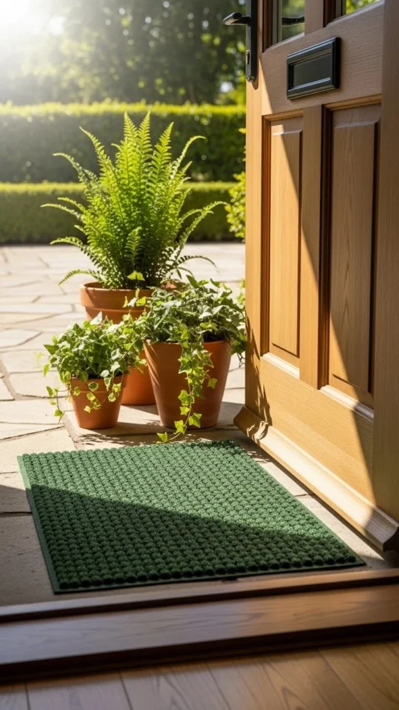 A green mat adds seasonal charm at the entrance. Choose simple patterns.