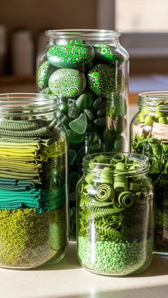 Glass jars create easy decor using items you already have. Layer green fabric, paper shreds, or painted stones inside.