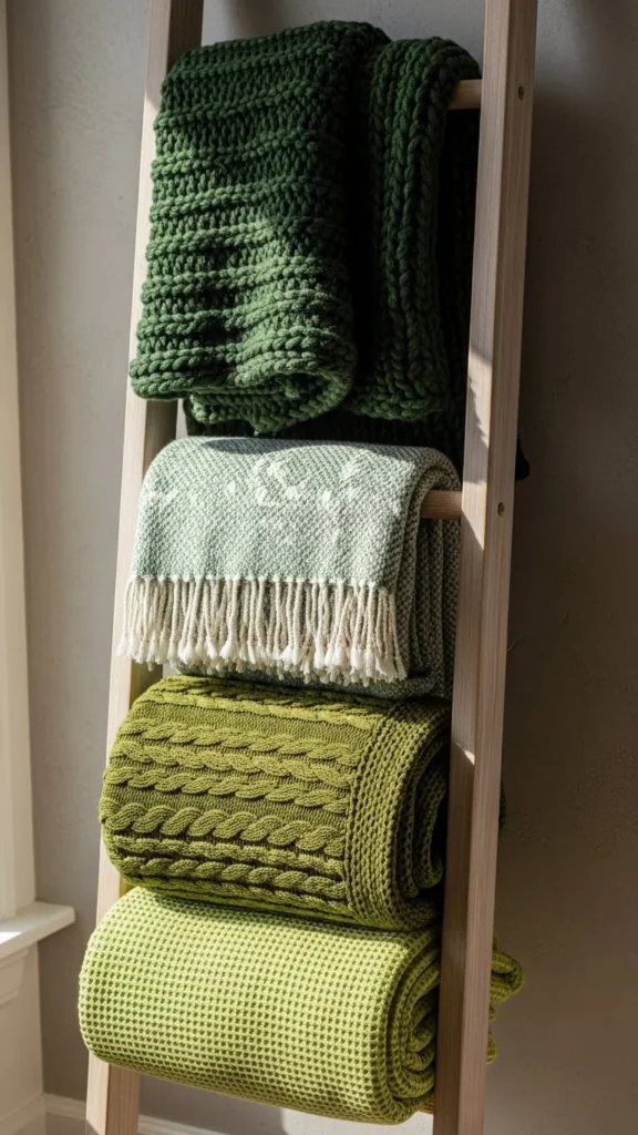 A blanket ladder adds height and softness. Fold green blankets neatly rather than draping them loosely.