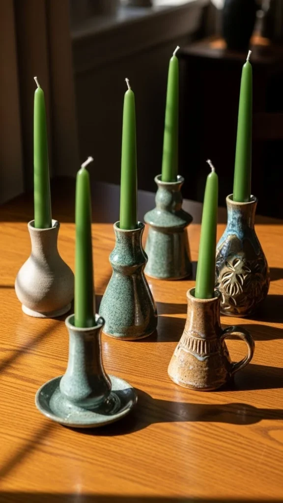 Use simple holders in ceramic or metal. Avoid heavy decoration around them.
