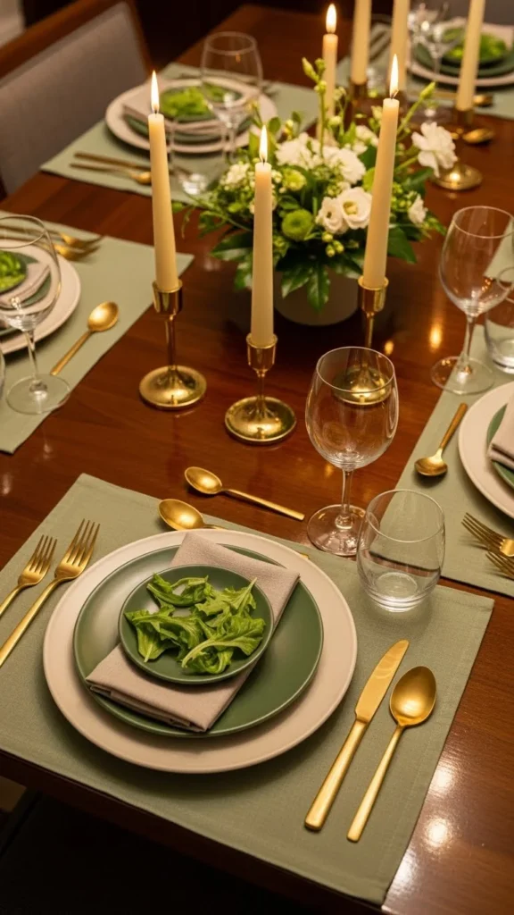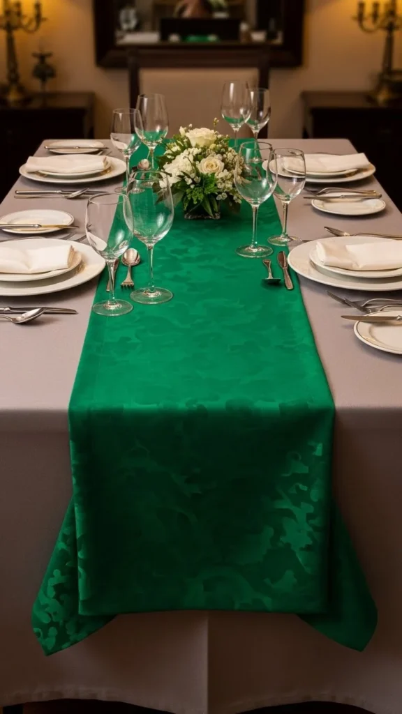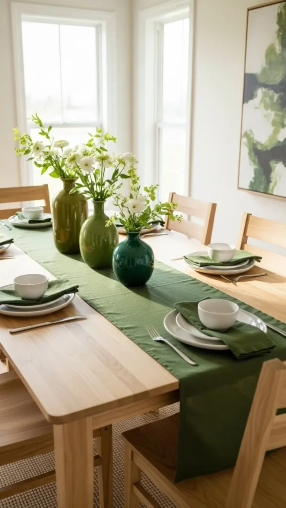 Layer a green runner over a neutral tablecloth for depth. This adds color while keeping balance.