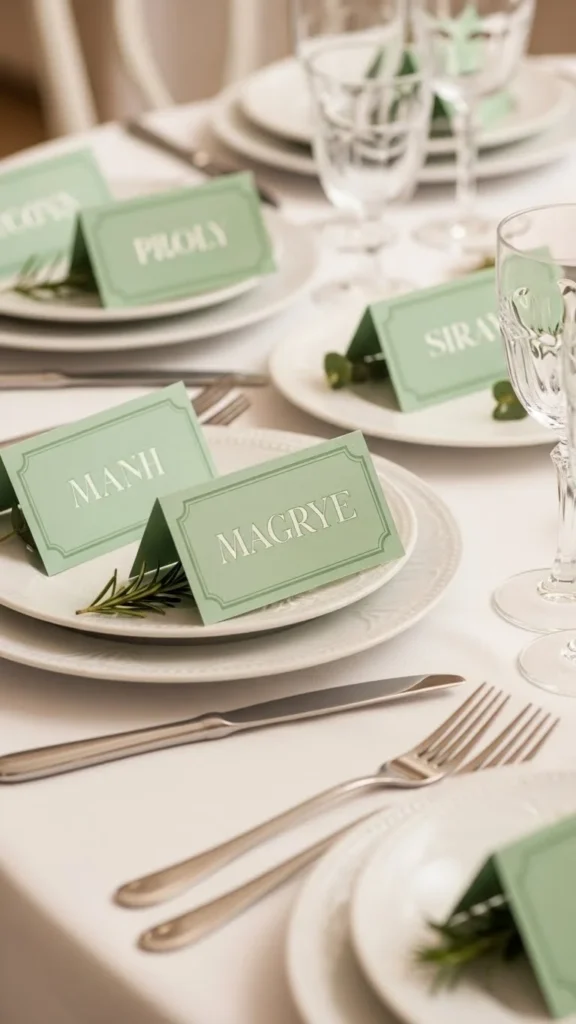 Handwritten place cards add a personal feel. Use green cardstock or tags for the holiday.