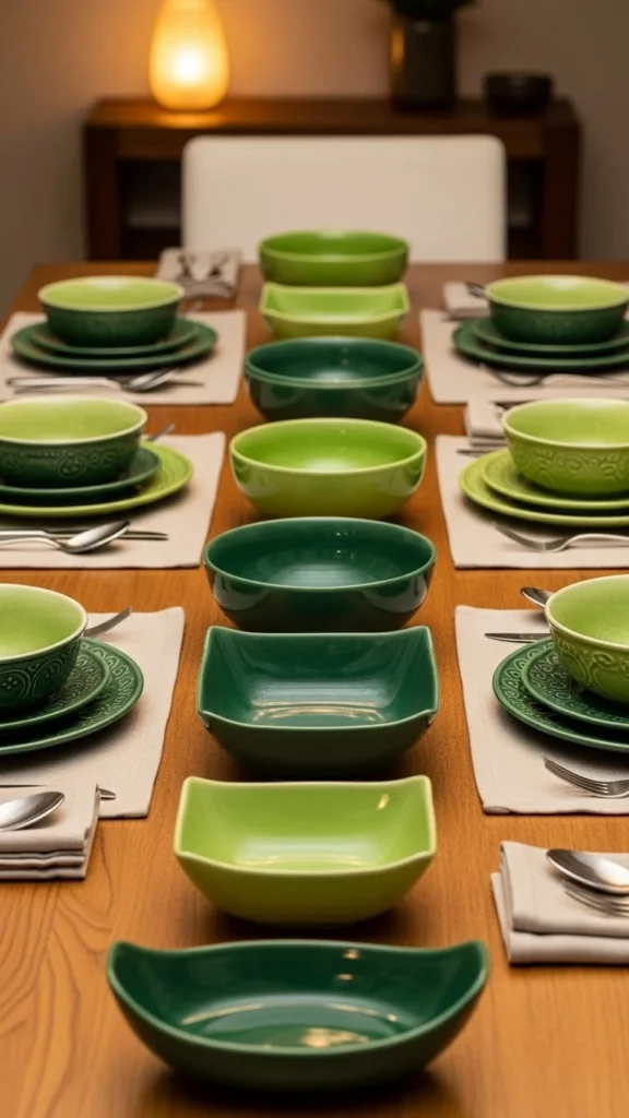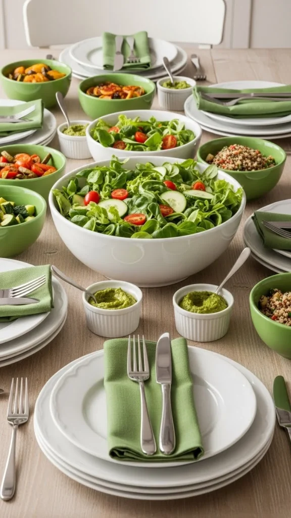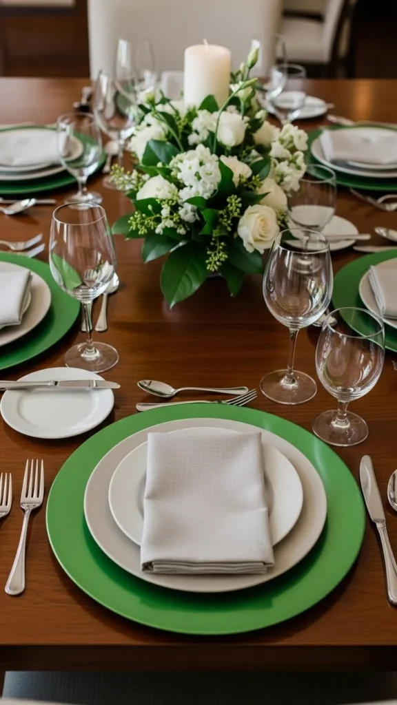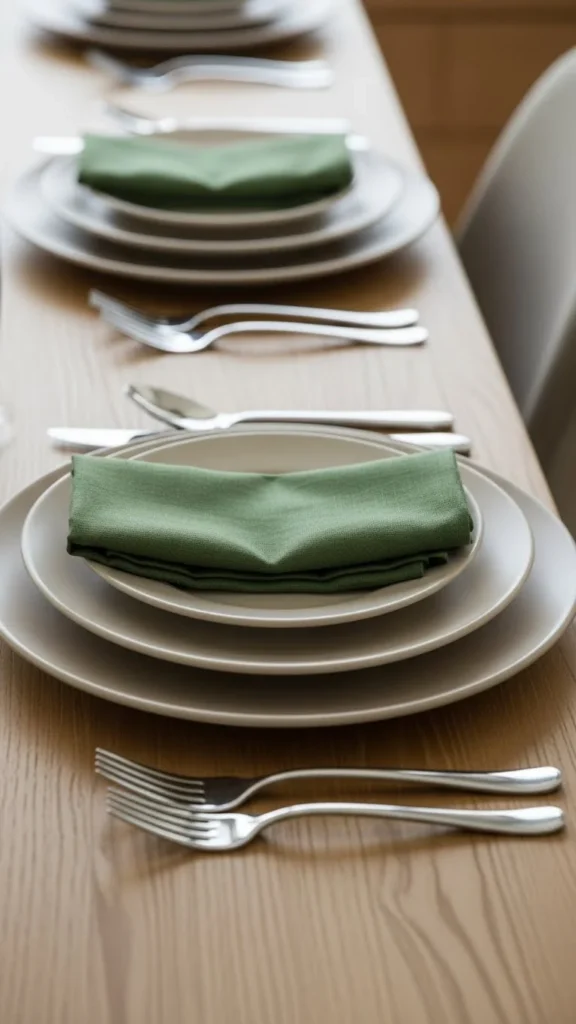 Layering plates adds depth without clutter. Start with neutral dinner plates and add a smaller green plate or napkin on top.