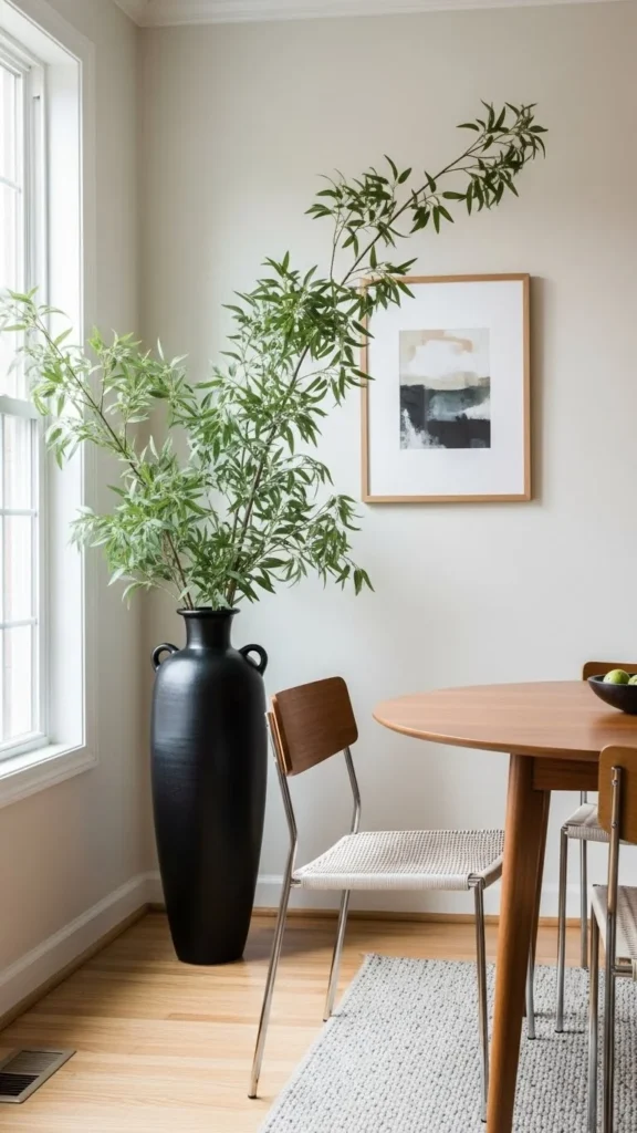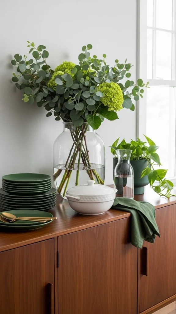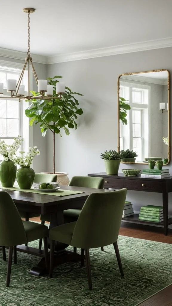 A deep green tablecloth sets the tone instantly. It brings color while keeping the dining room grounded and calm. Choose cotton or linen for a relaxed drape that doesn’t feel stiff.