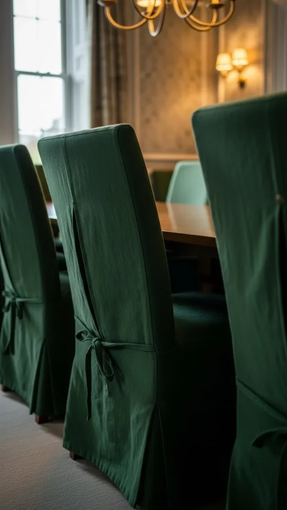 Chair covers create a unified look for special meals. Linen or cotton keeps them relaxed.