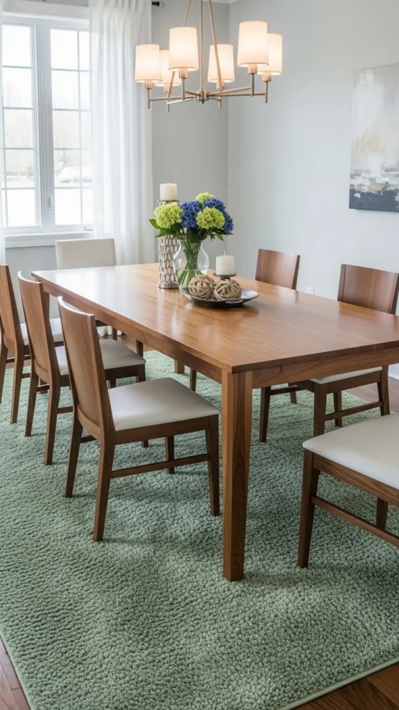 Choose low-pile rugs for easy chair movement. If buying new isn’t possible, layer a green throw nearby instead.