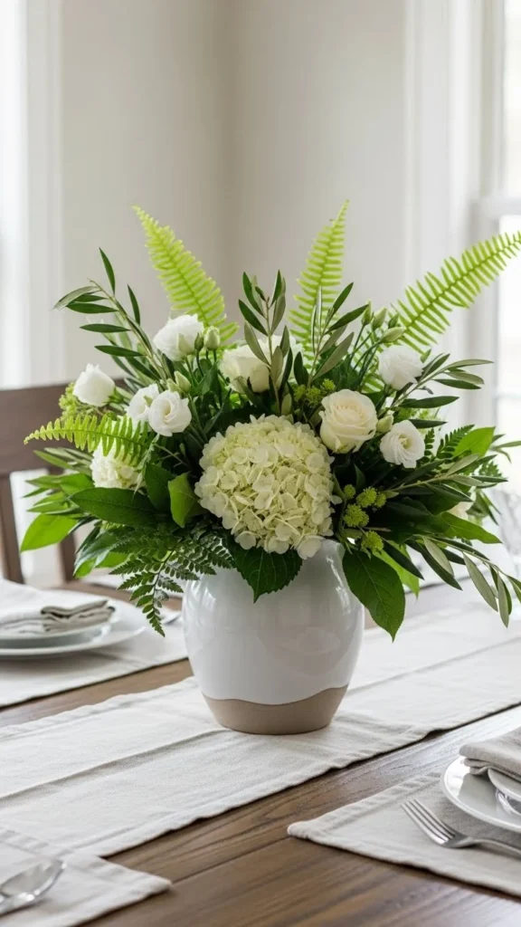 A simple floral arrangement sets the mood without blocking conversation. Use greenery mixed with white flowers for balance.