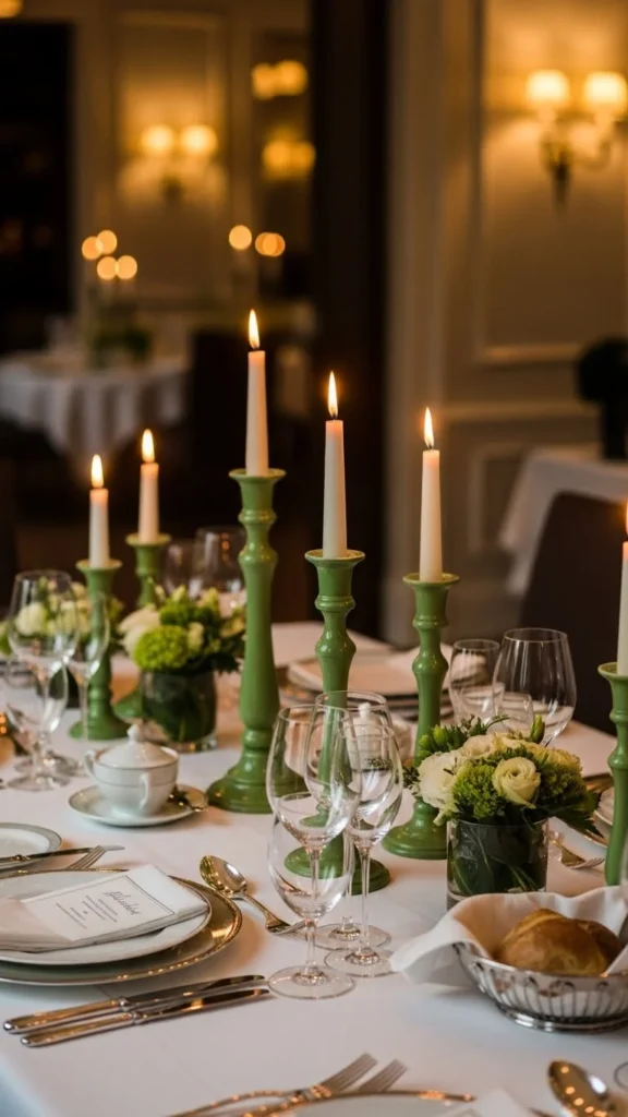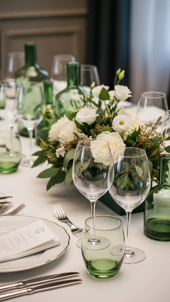 Green-tinted glasses bring color without adding extra items. Even one glass per setting makes an impact.