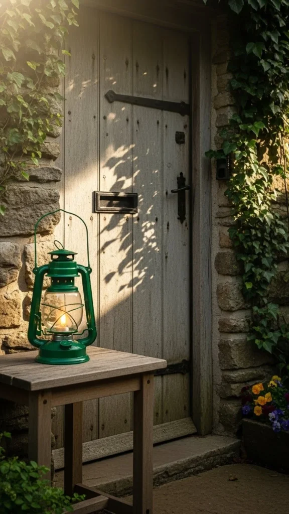 A lantern adds structure to your entry. Use one you already own and place a green item inside. Keep it simple and weather-safe.