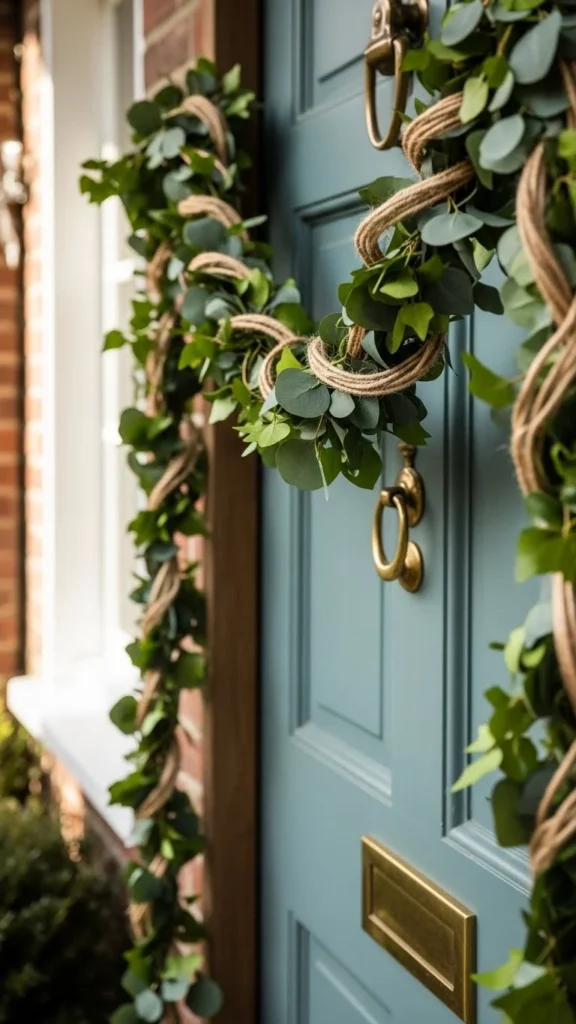 A green wreath is one of the easiest ways to dress up your door for the season. Start with a basic faux greenery wreath or reuse one you already own. Add a soft ribbon in a solid shade to keep it calm and welcoming. Fabric scraps, burlap, or cotton work well and cost very little.