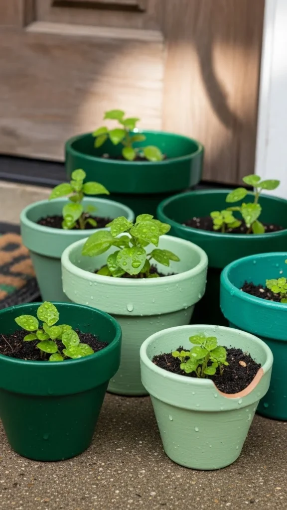 Paint small clay pots in green shades. Stack or group them near the door.