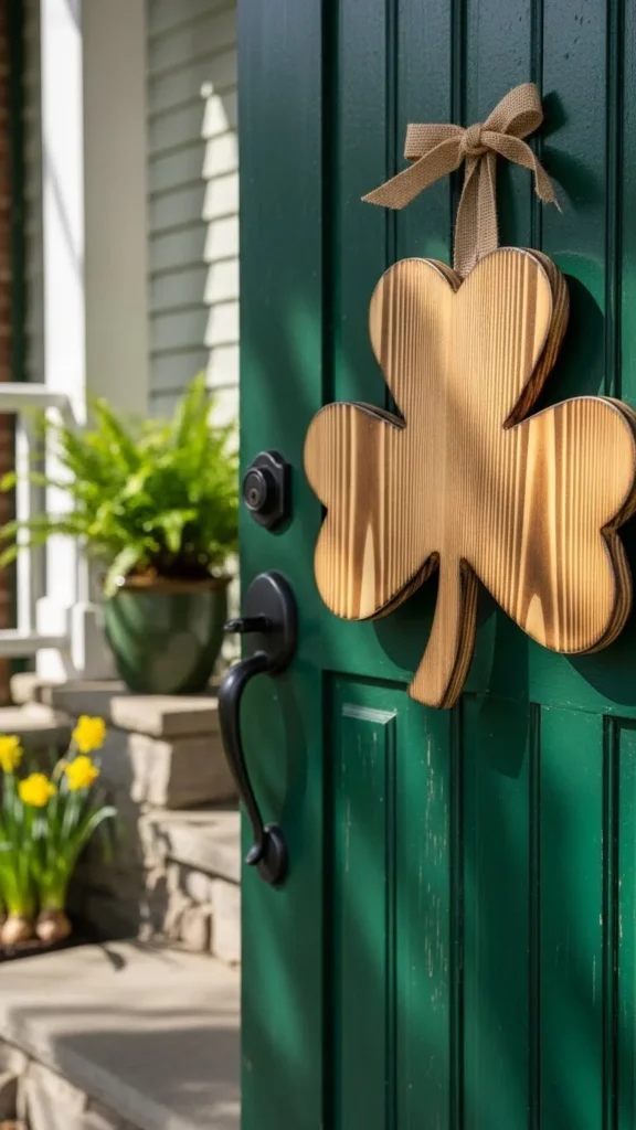 A wooden shamrock adds charm without feeling loud. You can find unfinished wood shapes at craft stores or cut one from thin plywood. Paint it green or leave it natural for a softer look. Twine or jute rope works well for hanging.