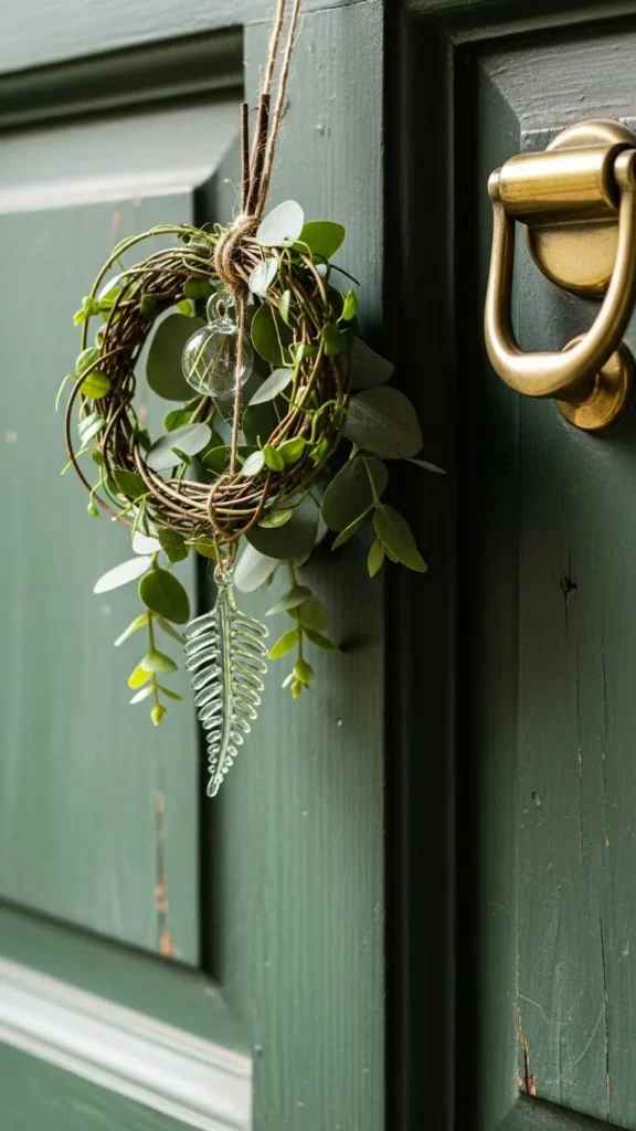 Hang the wreath using a removable hook to avoid damage. If your door is dark, lighter green tones help the wreath stand out. For a personal touch, tuck in a small bundle of faux leaves or a fabric bow made at home.