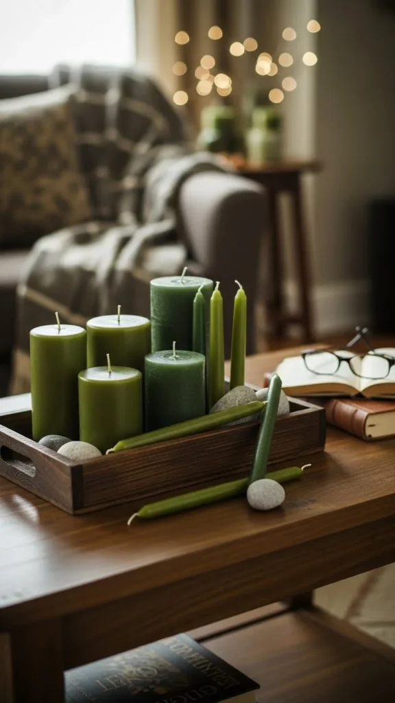 Candles add warmth to any space. Choose green ones in simple shapes. Group three together for balance.