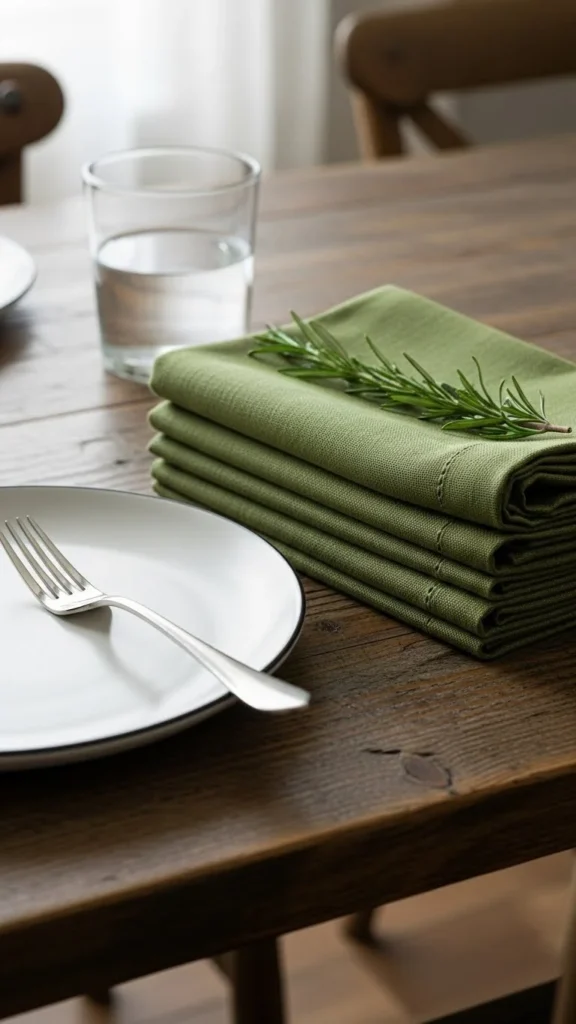 Swap paper napkins for fabric ones. Green napkins instantly change the table’s look. Cotton or linen works best.