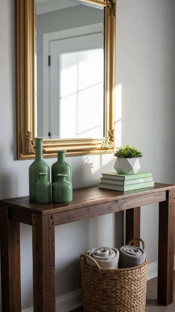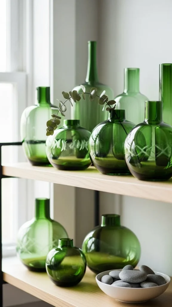 Green glass catches light beautifully. Look for bottles or vases in thrift shops. Group them together on a shelf or table. Add simple branches or leave them empty.