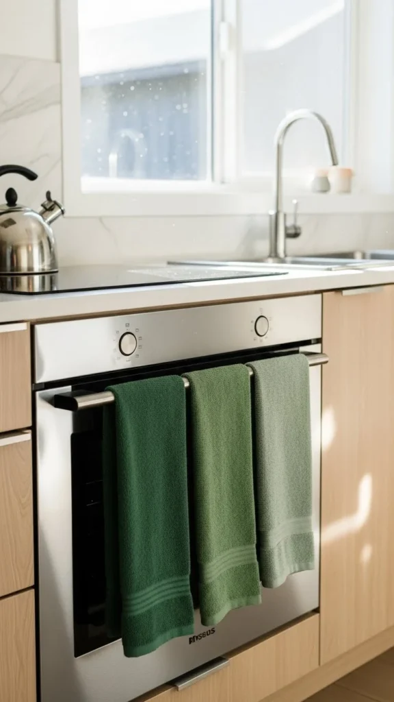 Kitchen towels are easy to swap. Choose solid green or subtle patterns. Hang them on handles or hooks.