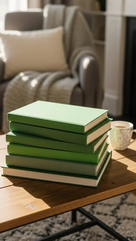 Books double as decor. Stack ones with green covers on tables or shelves. Turn spines inward if text shows.