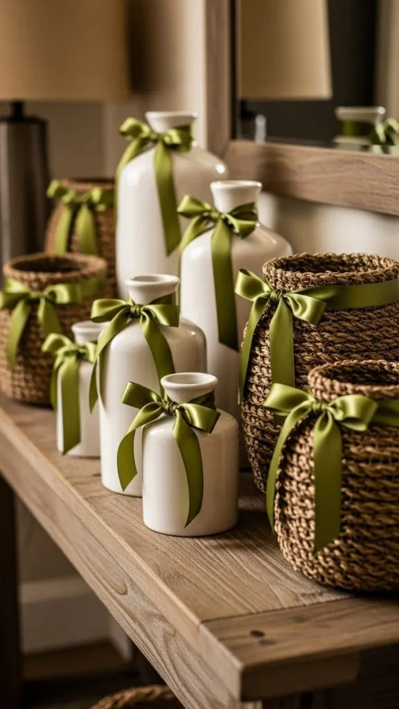Ribbon is flexible and affordable. Tie green ribbon around vases, baskets, or candle holders.