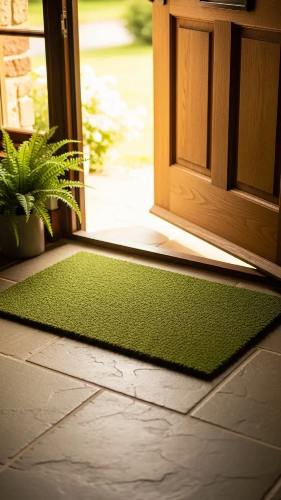 A green mat welcomes guests subtly. Choose a plain design without words.