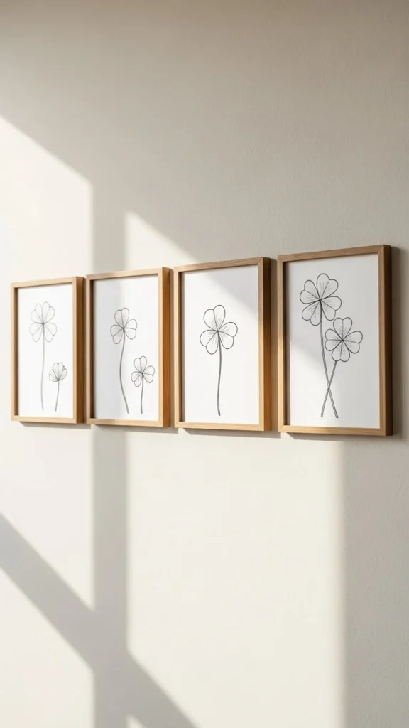 Hang two or three prints in a small cluster. Entryways and hallways work well. You can also lean them on a shelf. If you enjoy drawing, sketch your own clovers with a marker. That adds a personal touch.