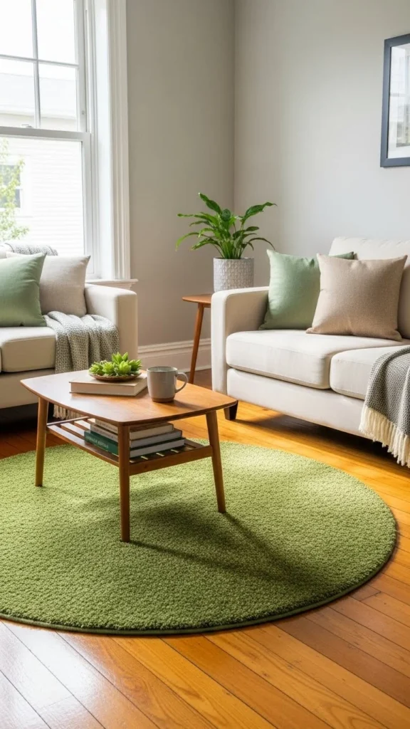 A small rug adds color underfoot. Choose a muted green shade.