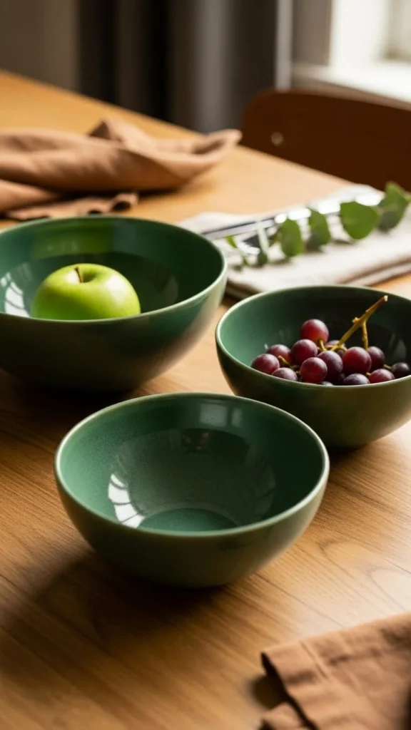 Green bowls work as decor and function. Fill them with fruit or leave empty.
