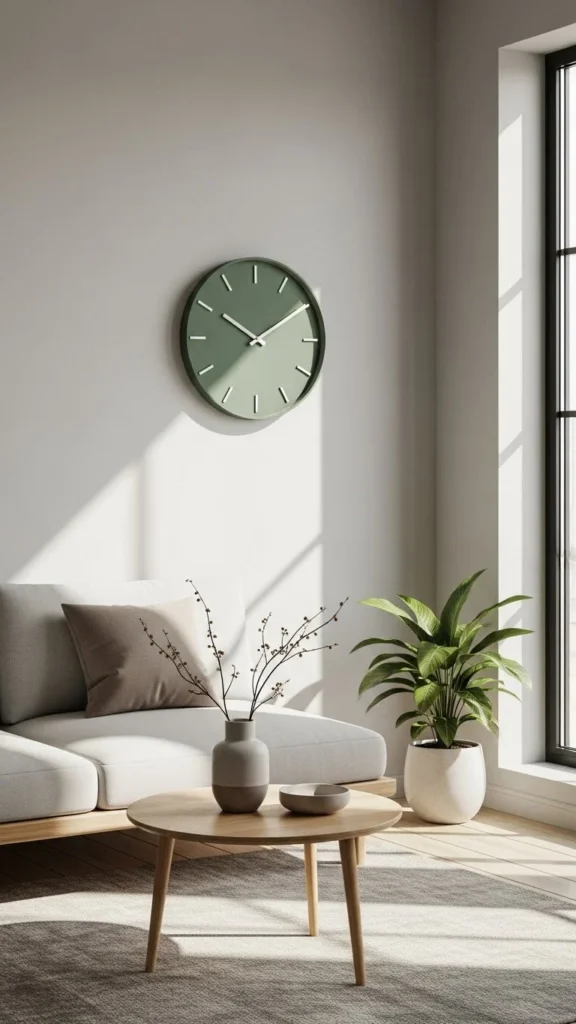 A green clock adds color to vertical space. Choose a clean design.