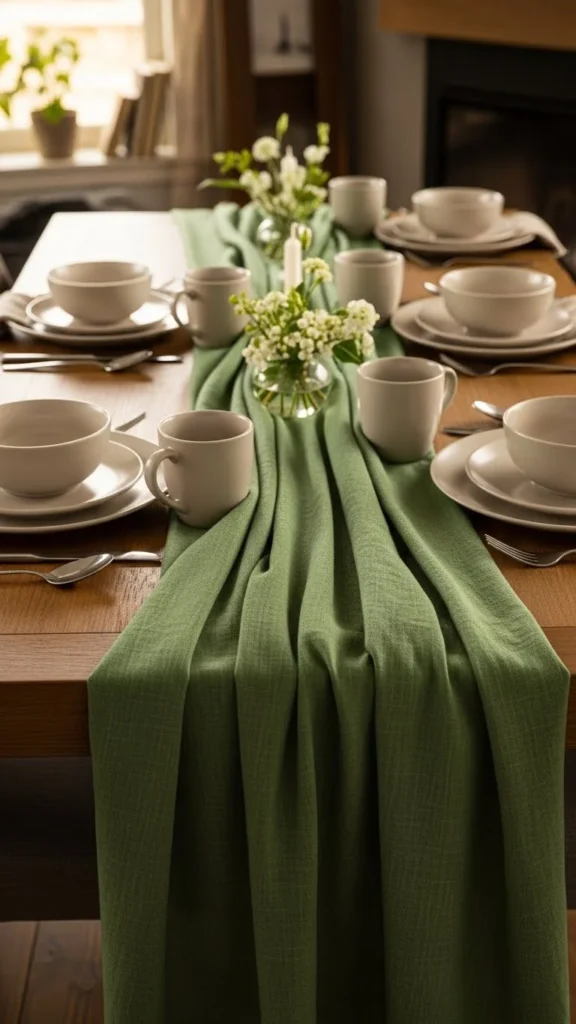 A table runner changes the mood of a dining space instantly. Choose a green fabric with a soft weave. Cotton or linen works well. Lay it across the center of the table. Keep place settings simple.