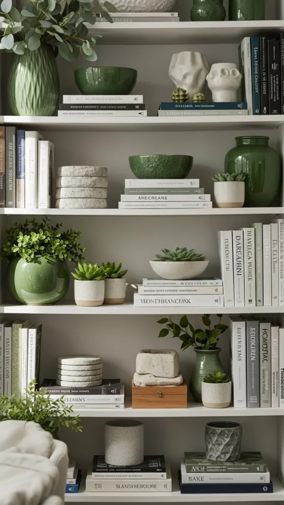 8. Shelf Styling with Green Accents