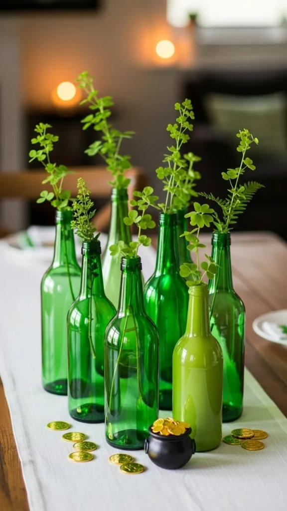 Reuse green glass bottles as slim vases. Remove labels and add a single stem. This creates height without blocking views. Mixing different bottle shapes adds charm while staying simple.