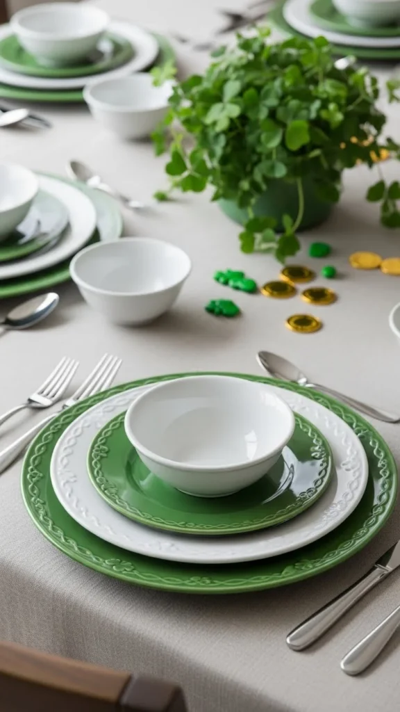 Mix white bowls with green plates or vice versa. Layering adds depth using items you already own. Keep patterns minimal so the colors stay balanced.