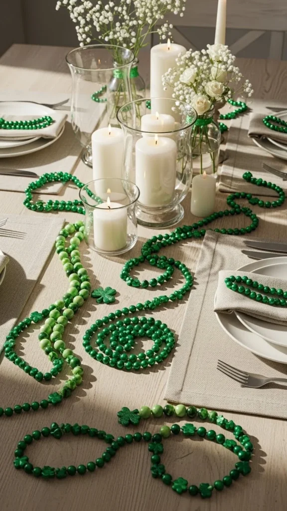 Green bead garlands add texture. Lay them loosely down the table. Avoid heavy piles. A little goes a long way.