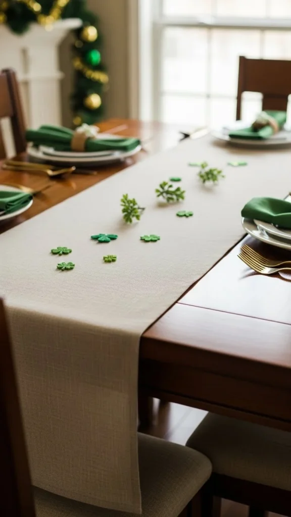A beige or cream runner creates a calm base. Layer greenery, small bowls, or candles on top. This keeps the table from feeling too green-heavy. You can make a runner from fabric remnants or a scarf. The relaxed layers feel inviting.