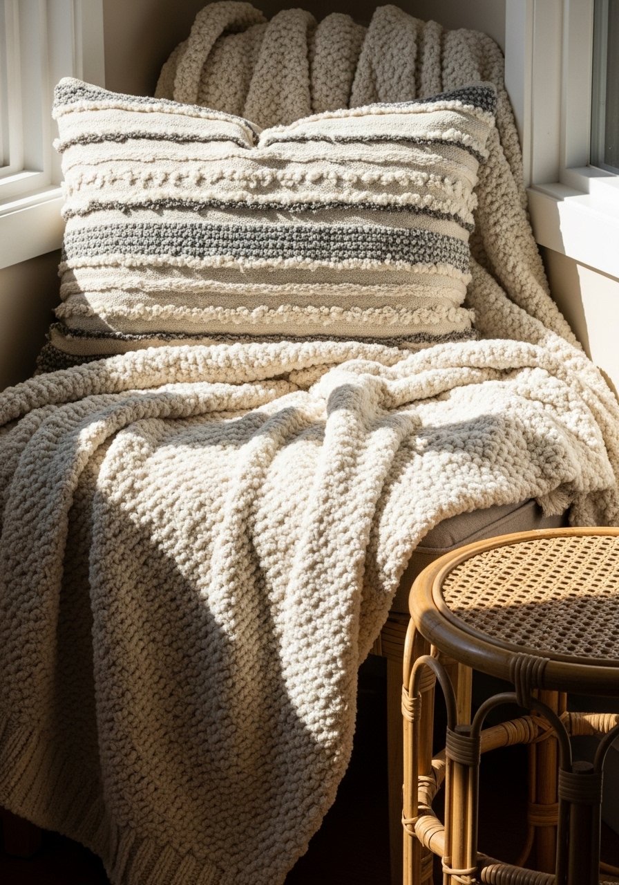 I layered a cream chunky knit throw over a slim armchair and added velvet pillow covers for contrast; the combo made my corner feel like a dedicated retreat. I used this cream chunky knit throw and a 20"x20" velvet pillow set to keep proportions cozy. Avoid overstuffing with too many patterns — aim for three textures and stick to warm neutrals plus one accent color for balance.