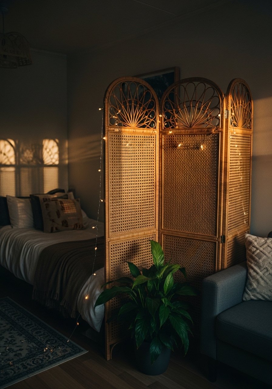 I used a three-panel rattan screen to separate my bed from the sofa; it adds texture while letting light through. A rattan screen reads lighter than a bulky bookcase and pairs well with warm wood accents from West Elm or Ikea. I recommend a 60–70" high screen. Common mistake: placing the divider too close to the bed — leave a 12–18" walkway so the zone breathes and feels intentional.