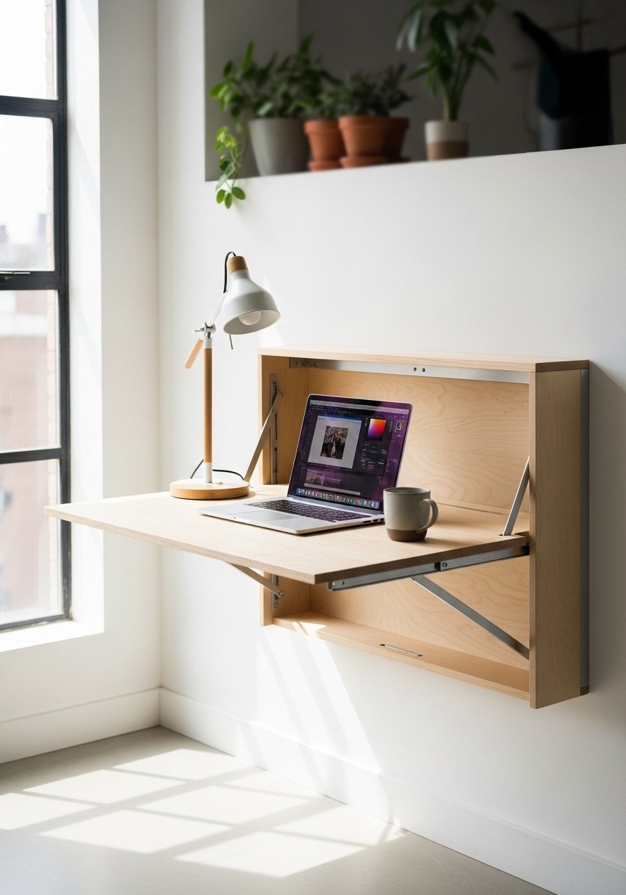 - Compact fold-out desk, wall-mounted (~$80-130)