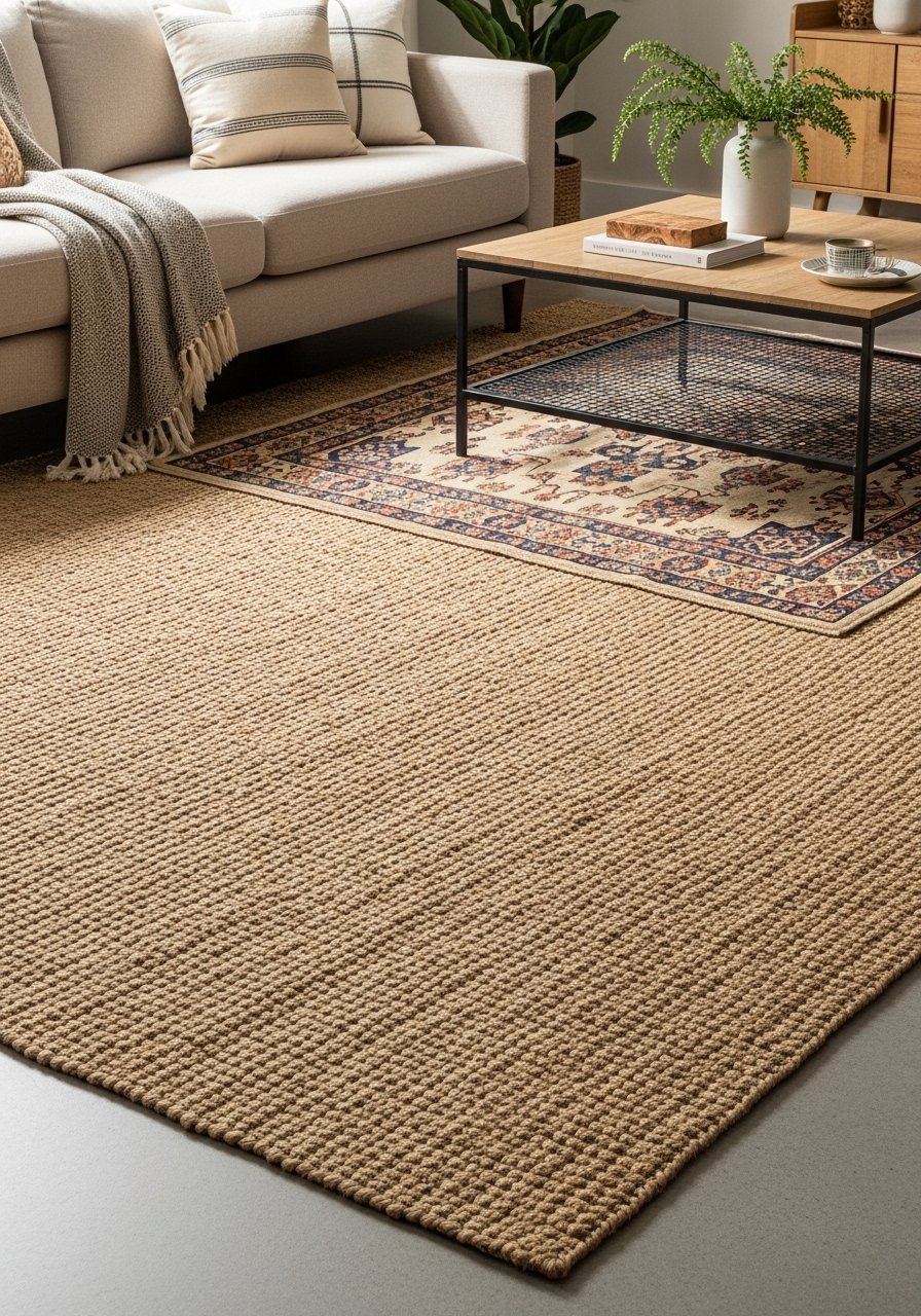 Choose a neutral 8×10 rug to anchor zones: This 8×10 jute rug grounds furniture and reads natural across styles.