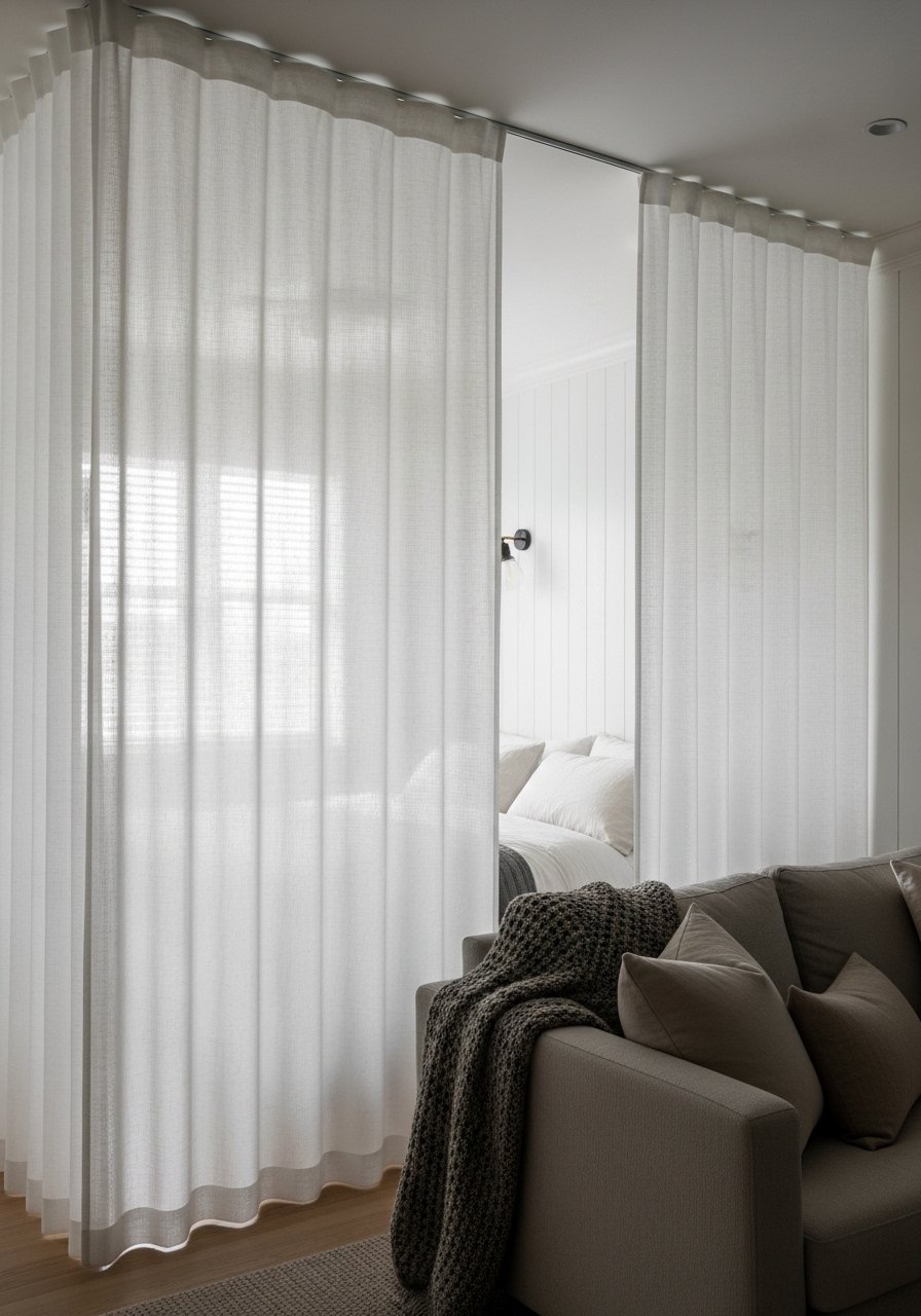 I hung linen panels from a ceiling-mounted track to create a soft bedroom curtain — it added height and a sense of privacy. Use 84–96" panels for standard rooms; for tall ceilings choose 108–120". I used neutral linen blend curtains and clipped them back during the day. A common mistake is hanging curtains too low; always mount as close to the ceiling as possible to visually lift the space.