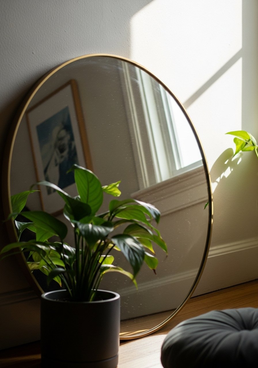 A large round mirror opposite my window doubled the daylight and made the whole studio feel larger. I picked a 36-inch diameter with a slim frame to keep proportions balanced against my sofa. Mirrors also help define zones by reflecting a specific area, like a dining nook. Avoid heavily ornate frames in tiny spaces — they compete visually. Keep the mirror at eye level or slightly lower when leaning for the best effect.