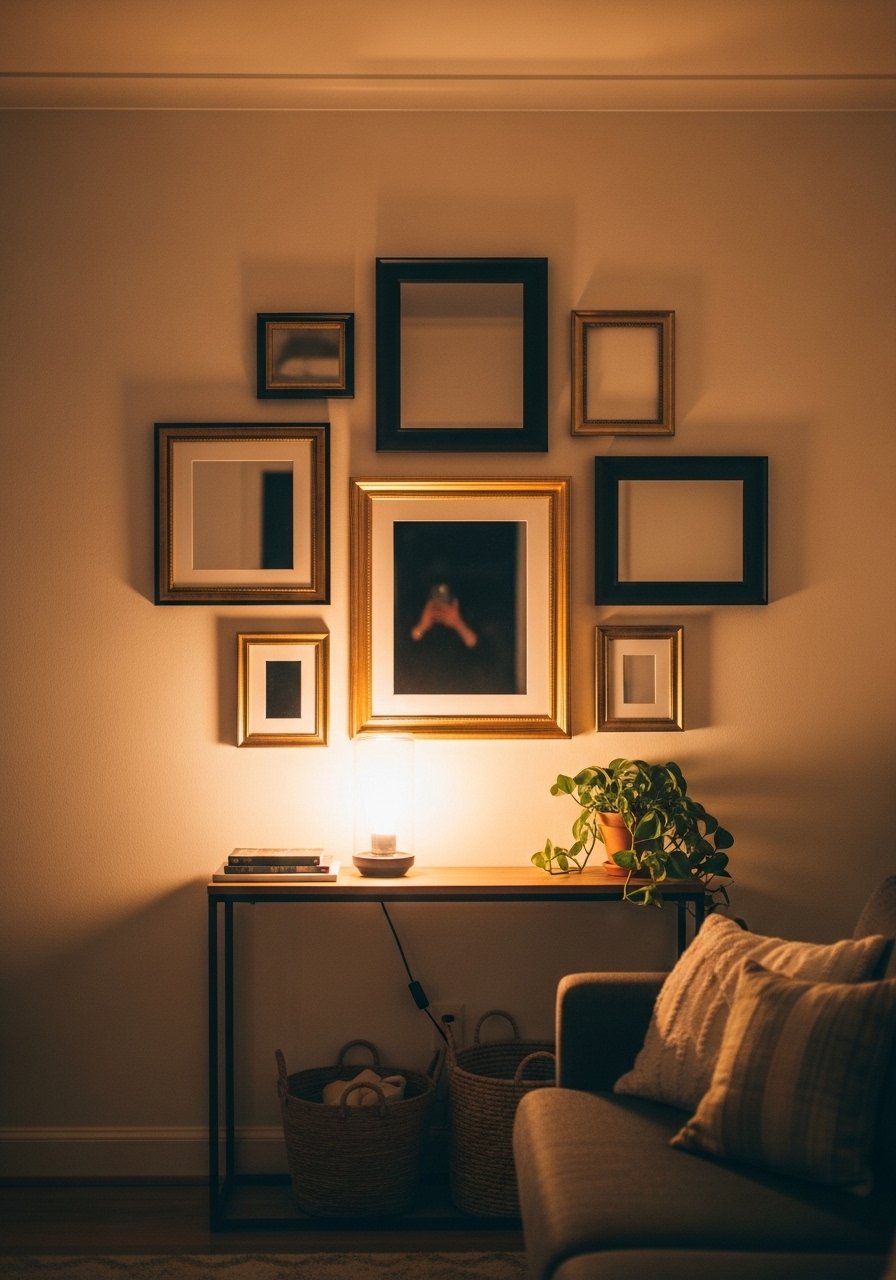 My entry sits right by the kitchen, so I made a gallery wall to claim that zone. I thrifted frames and balanced them with new white mats for cohesion. I mix black and brass frames and keep spacing at 2-3 inches for rhythm. One mistake is hanging pieces randomly; sketch a layout on the floor first. Use a vertical group near a console to visually separate the entry from the cooking area.