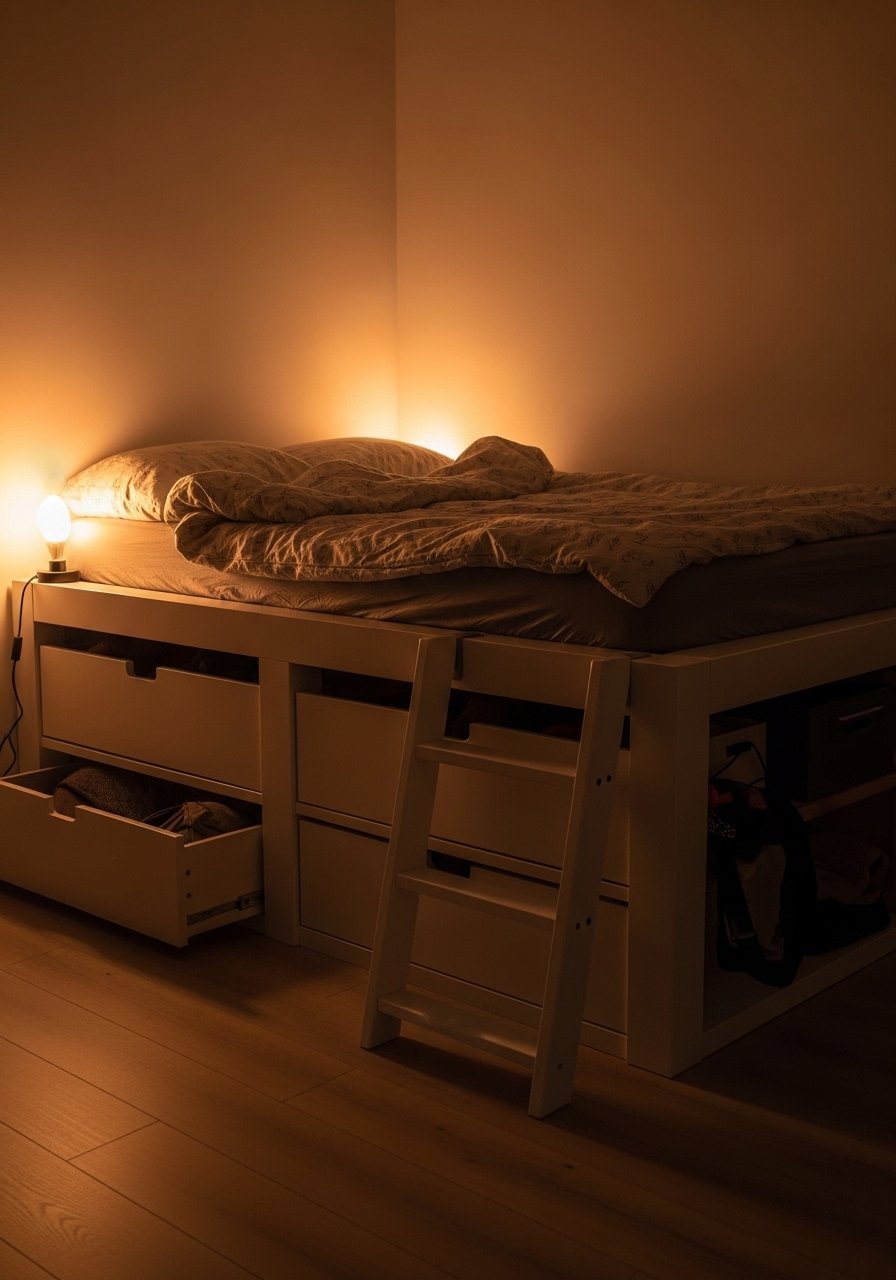 I built a low platform bed with drawers beneath to create both separation and storage. In studios, vertical solutions win — the platform defines the bedroom without walls. I left an open side for airflow and added a slim curtain for extra privacy. Mistake to avoid: using a platform that’s too high with no railings — it can feel unstable. Aim for a platform height you can access comfortably and that allows storage beneath.