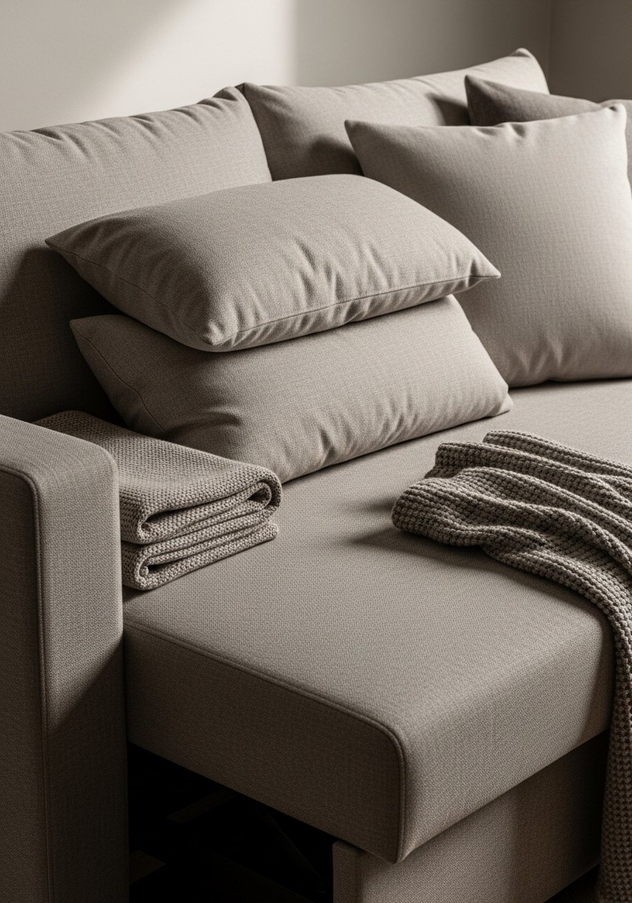 I chose a compact convertible sofa that’s comfortable for daily use and converts easily for guests. Pick a model with a mattress thickness of at least 4-6" for real sleep comfort. Avoid cheap click-clack mechanisms that wear quickly. Keep throw cushions stored in a basket so the sofa can be cleared quickly. This gives the living zone dual purpose without sacrificing style or sleep quality.