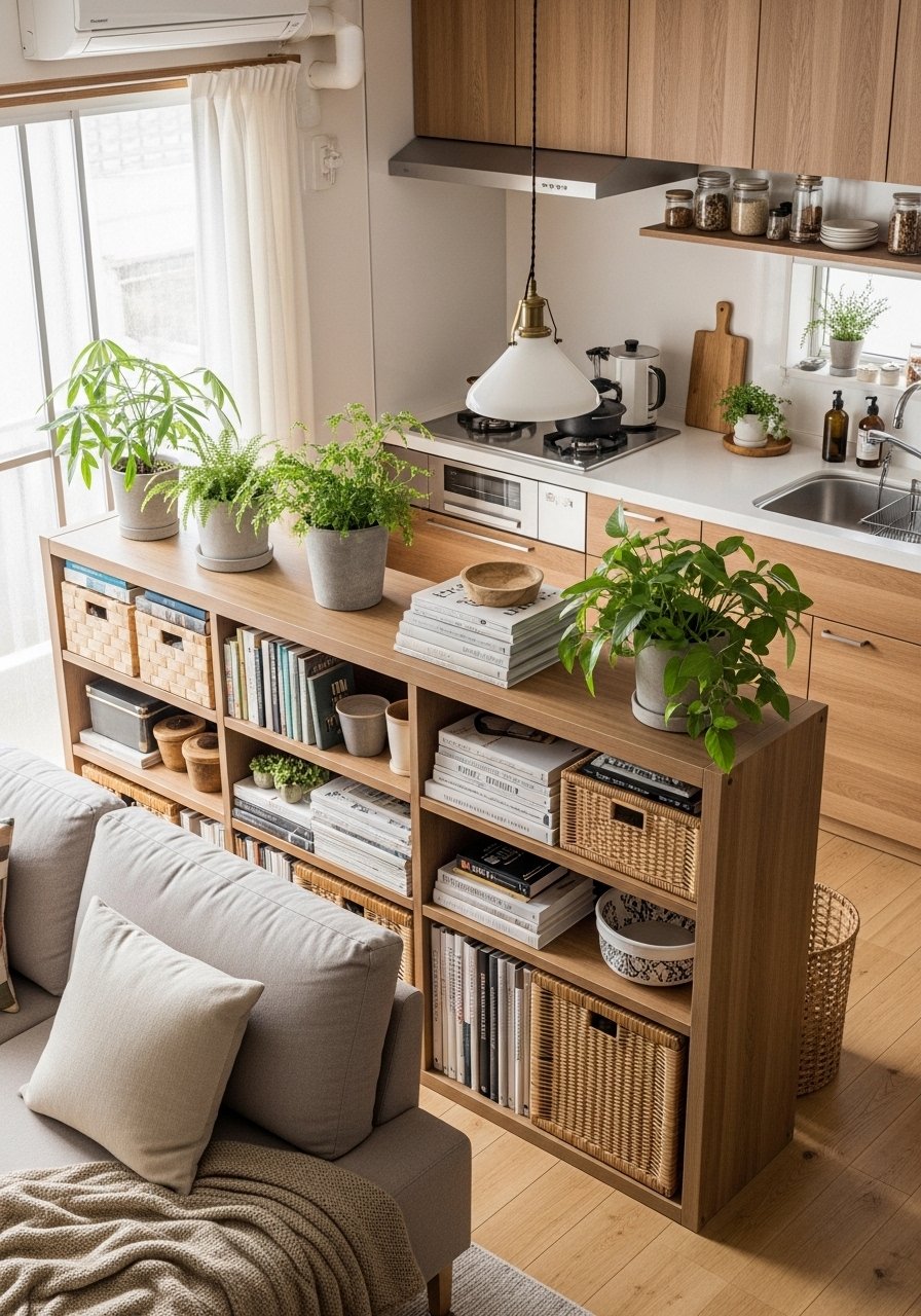 I used a low open bookshelf to split my sofa from the kitchenette; it provides storage and a clear visual border without closing the room. Keep styling balanced — books on one side, baskets on the other — to avoid a lopsided feel. Mistake: making the shelf too tall, which blocks sightlines. Aim for a height around seat back level (24–30") so the room stays connected.