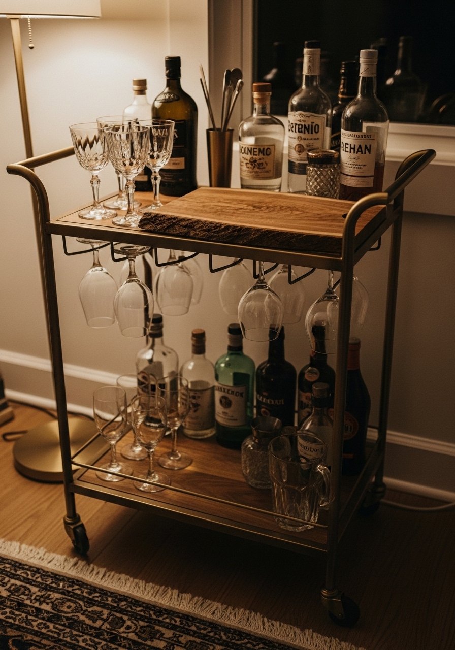 I styled a compact rolling kitchen cart as a bar zone and mixed brass handles with matte black trays for depth. Mixing metals keeps the area current; pick one dominant finish and use others as accents. Avoid matching everything — a little contrast reads intentional. Use a small wooden board and glass decanter to add organic texture. The cart keeps drinks and prep items contained and visually marks the bar area.