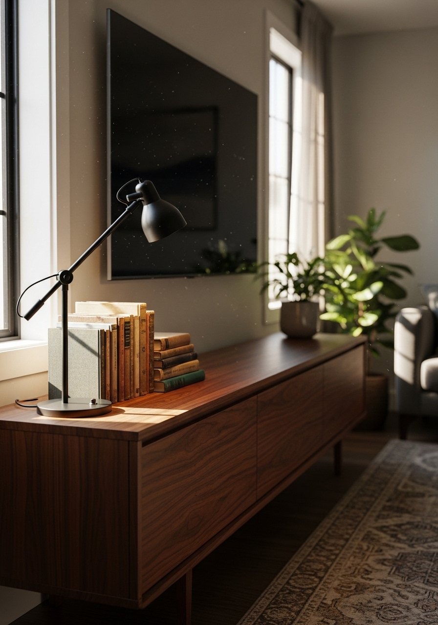 I went with a low TV console that has hidden drawers to stash remotes, cords, and blankets — it keeps the living area tidy and defined. Choose a width that aligns with your sofa length for proportional balance. Avoid open shelving under the TV for electronics if you have limited storage; closed drawers look cleaner. A console with a slim top gives a surface for a lamp to help the living zone feel intentional.