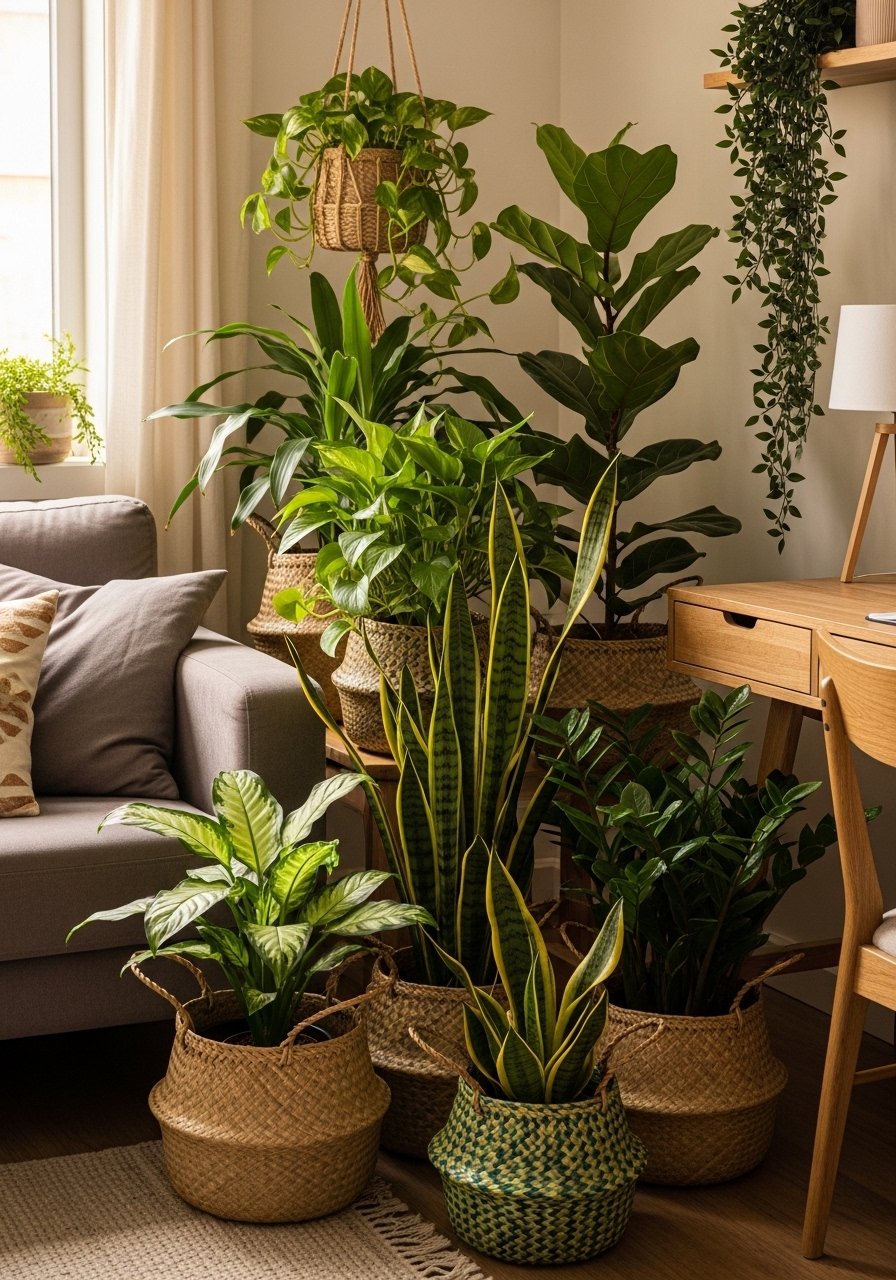 I grouped plants of varying heights to create a leafy divider between my sofa and the workspace. A 6-foot artificial fiddle leaf fig anchors the group while smaller potted plants add texture. Clustering plants mimics a partial wall and softens transitions. Mistake: scattering plants too thinly — grouping creates impact. This approach solves both the need for a visual boundary and the desire for biophilic texture in a small studio.