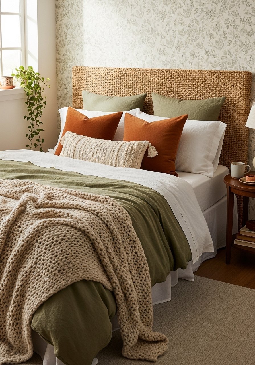 I anchored my sleeping area with a woven headboard and a subtle neutral peel-and-stick wallpaper panel. Texture behind the bed creates a cocoon effect and distinguishes the sleep zone from living areas. Avoid busy patterns that fight with bedding; keep scale moderate and colors warm. Using a half-wall of wallpaper behind the bed works well in studios and is reversible for renters. It instantly signals rest without heavy construction.